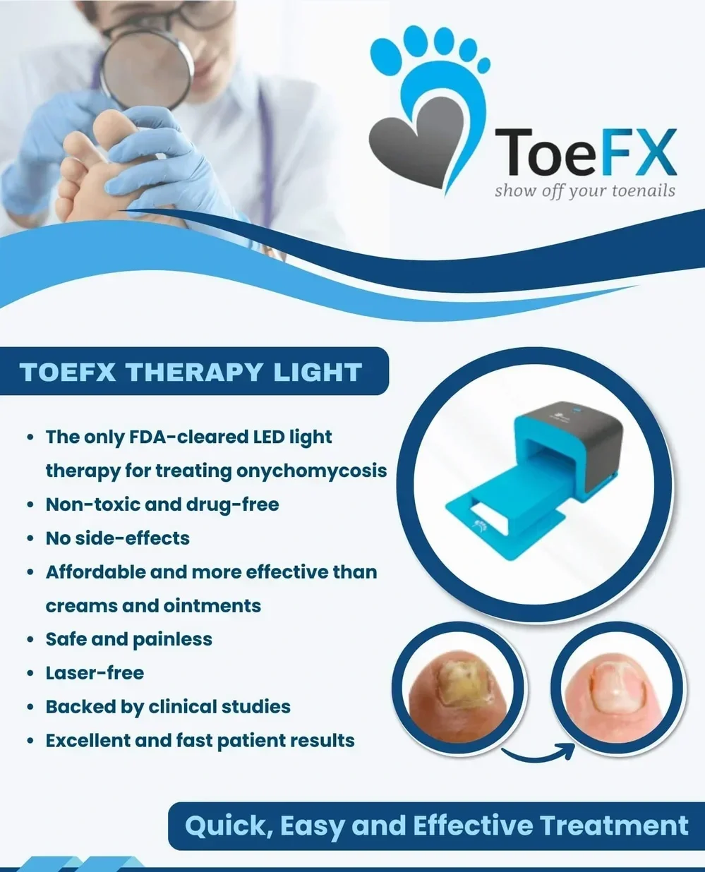 ToeFX is the only FDA cleared LED-based light therapy system for toenail fungus.